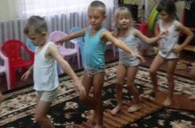 Воспитанники старшей группы "Цыплята" учатся ходить по канату приставным шагом.