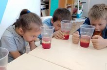 "Волшебство в стакане". Сегодня ребята, посещающие пришкольный лагерь, смогли увидеть настоящий эксперимент с растительным маслом и водой. Ребята узнали о свойствах воды и масла, о реакции воды и пищевого красителя, а также о том, как шипучие витамины создают пузыри в воде.