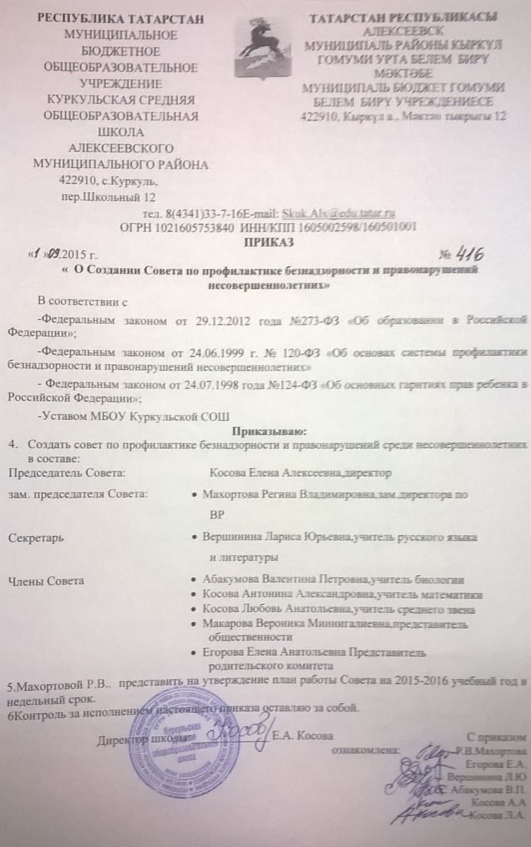 Приказ о создании Совета по профилактике правонарушений 2015г
