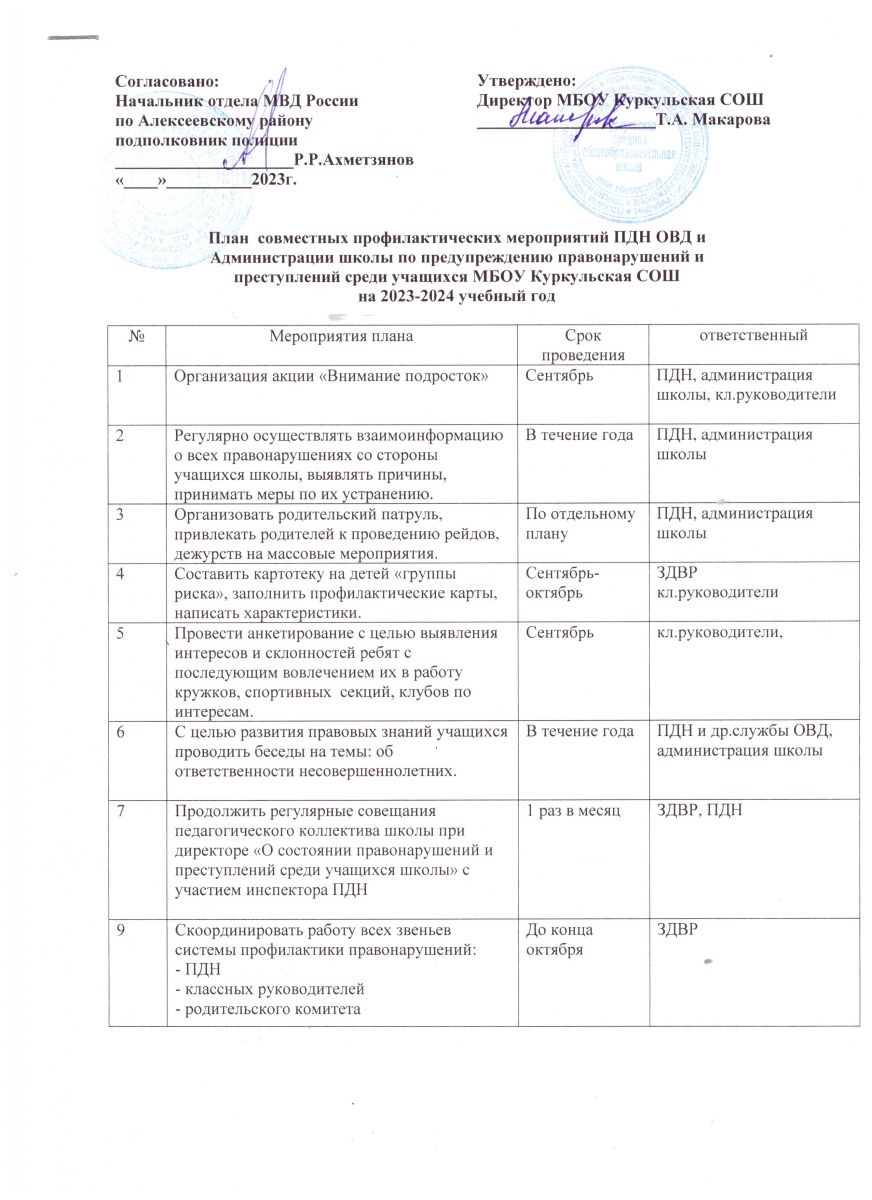 План совместной работы по профилактике правонарушений с ОПДН Алексеевского ОВД на 2019-2020 г