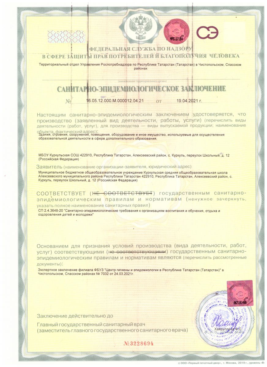 Санитарно-эпидемиологическое заключение от 19.04.2021 г