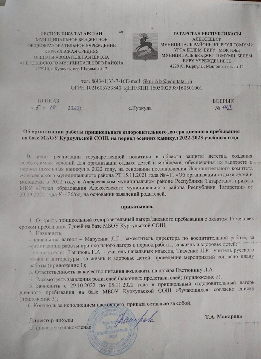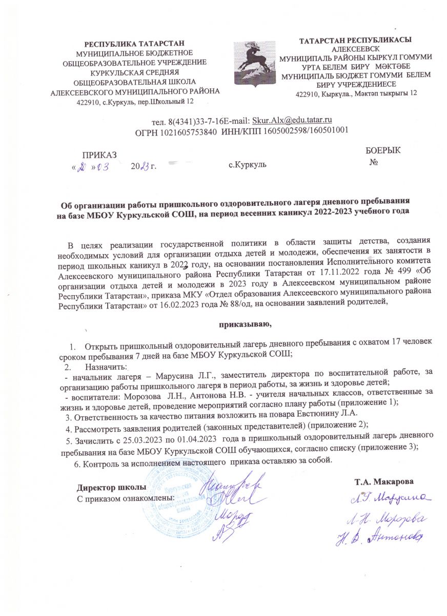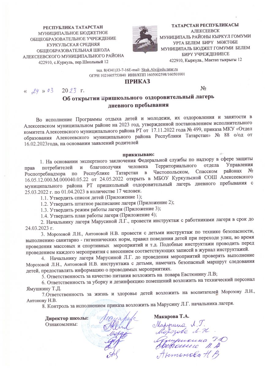 МБОУ Куркульская СОШ приказ об организации работы пришкольного оздоровительного лагеря 2023.jpg