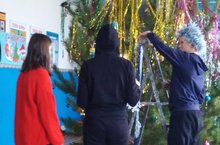 Для создания праздничного новогоднего настроения учащиеся школы украсили елку и зал.