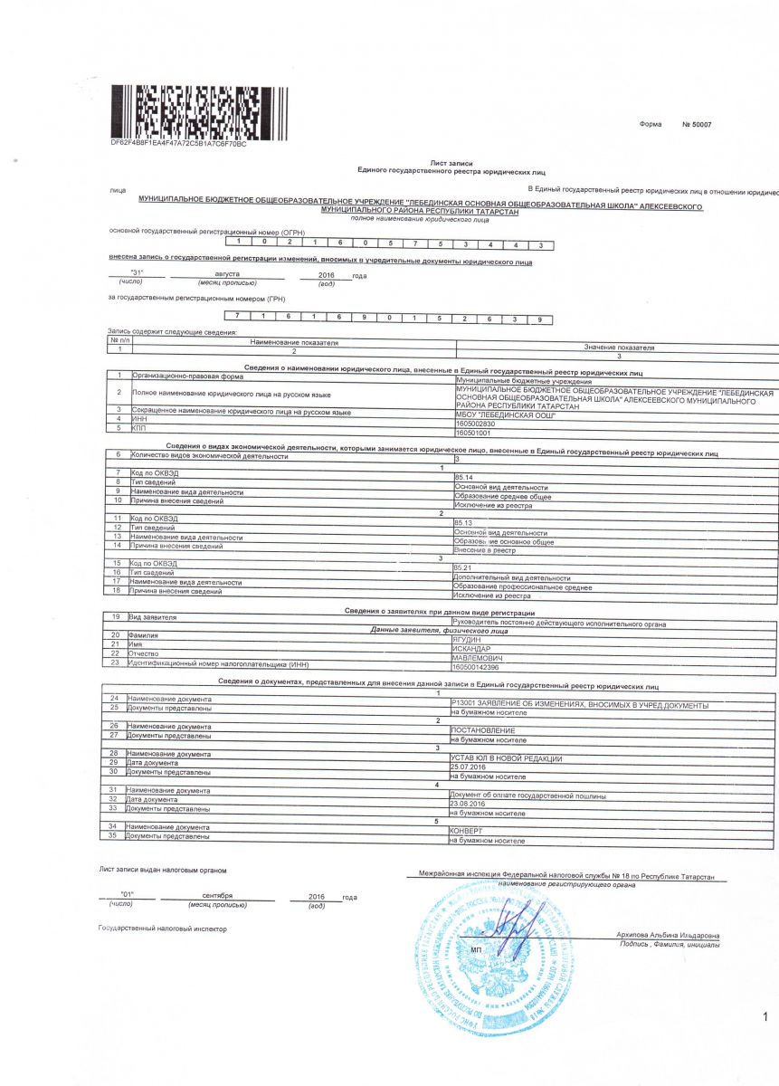 Муниципальное бюджетное общеобразовательное учреждение "Лебединская основная общеобразовательная школа" Алексеевского муниципального района Республики Татарстан / Татарстан Республикасы Алексеевск муниципаль районы "Лебедино гомуми төп белем бирү мәктәбе" муниципаль бюджет гомуми белем бирү учреждениесе