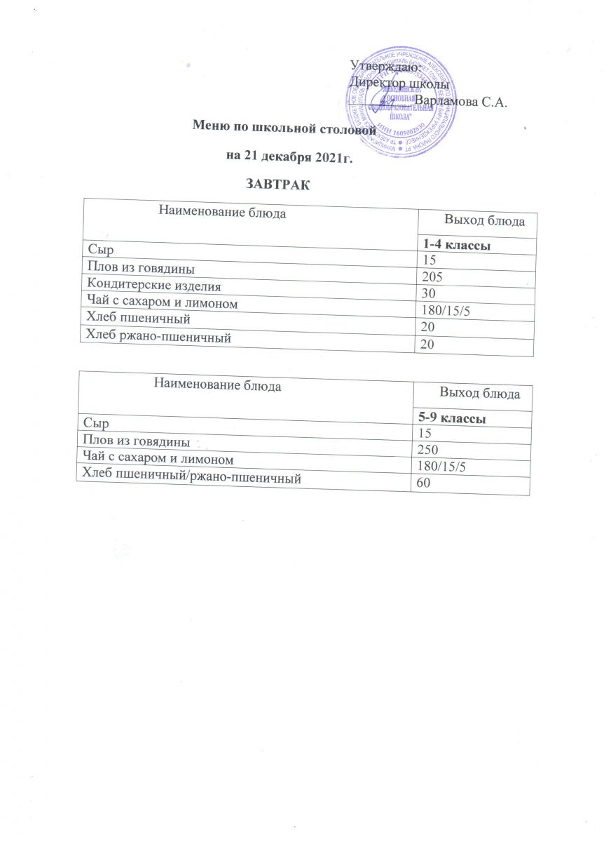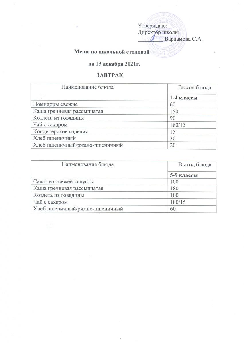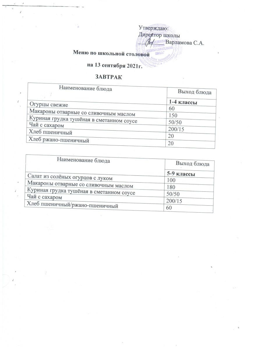 ОСНОВНОЕ ДВЕНАДЦАТИДНЕВНОЕ МЕНЮ ПО ШКОЛЬНОЙ СТОЛОВОЙ НА 2021 УЧЕБНЫЙ ГОД