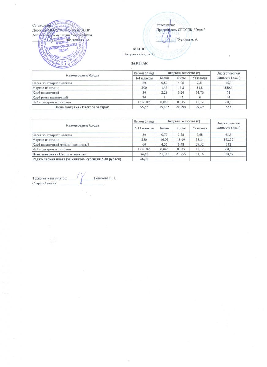Меню по школьной столовой на 2022г вторник 1 неделя