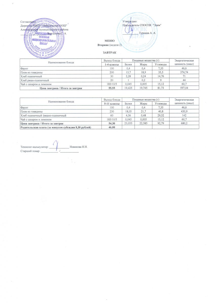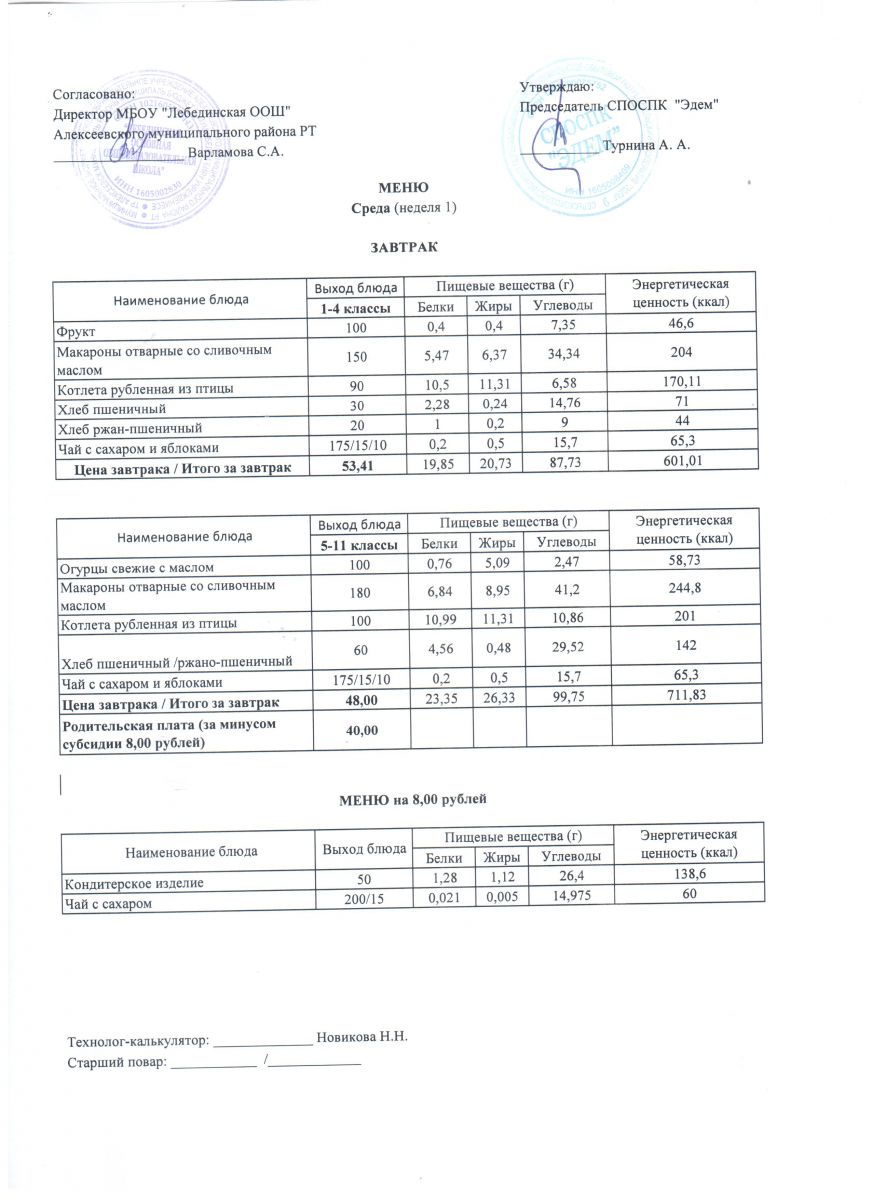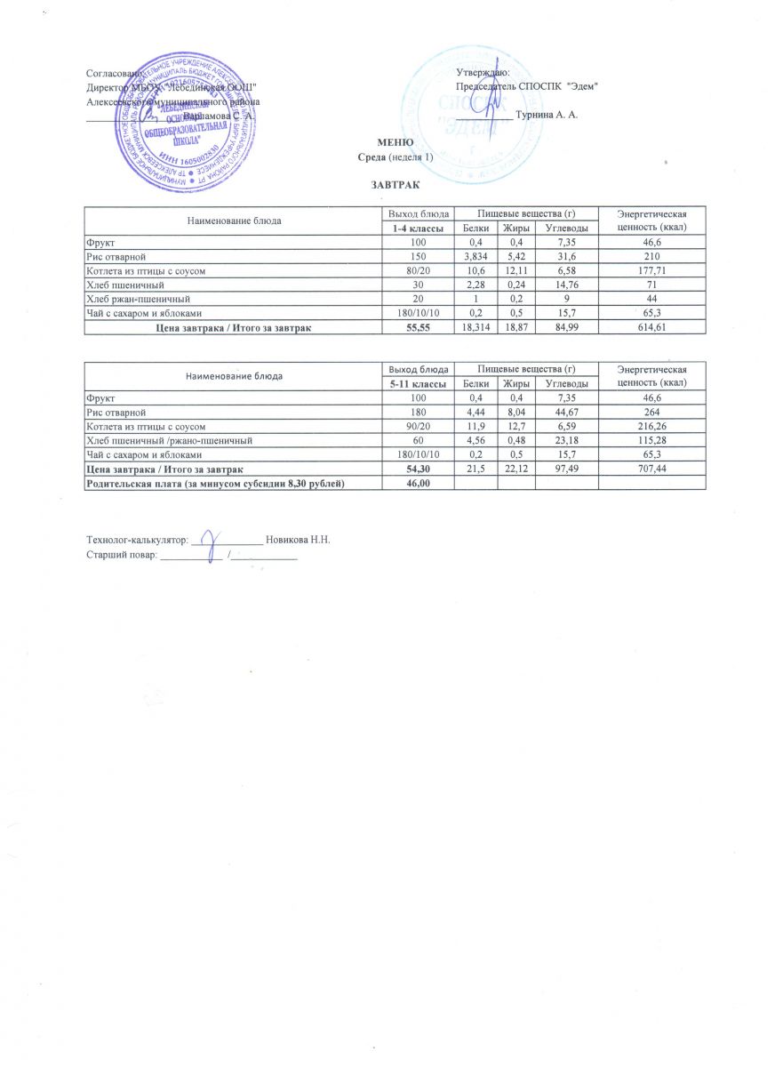 Меню по школьной столовой на понедельник 1 неделя 2021.