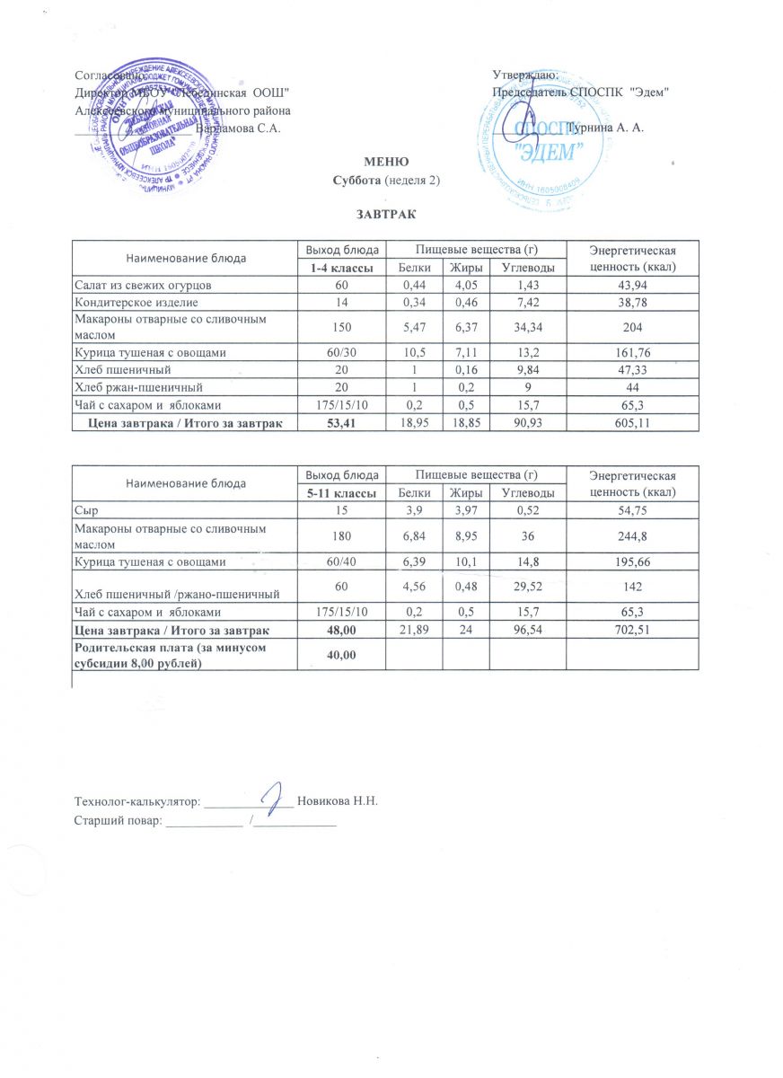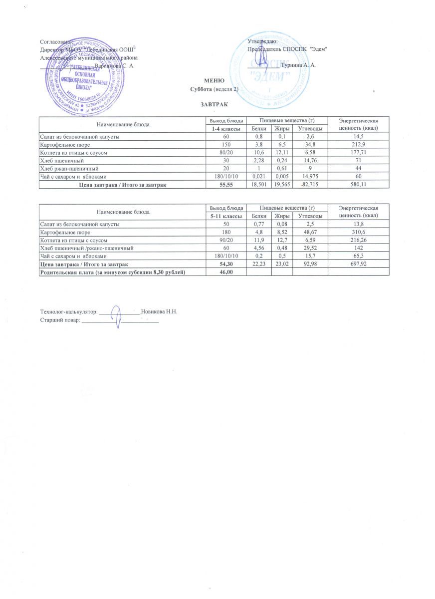 Меню по школьной столовой на 2022г суббота 2 неделя