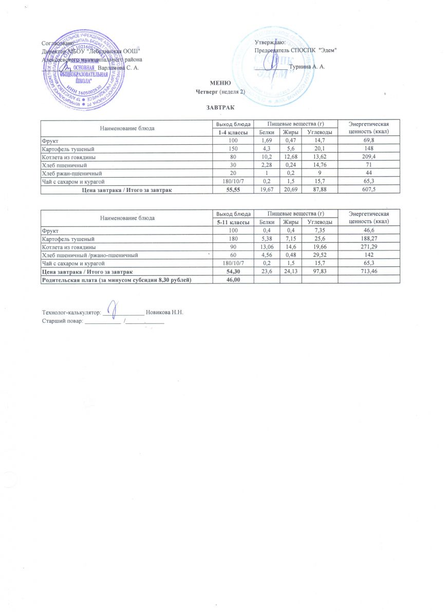 Меню по школьной столовой на 2022г четверг 2 неделя