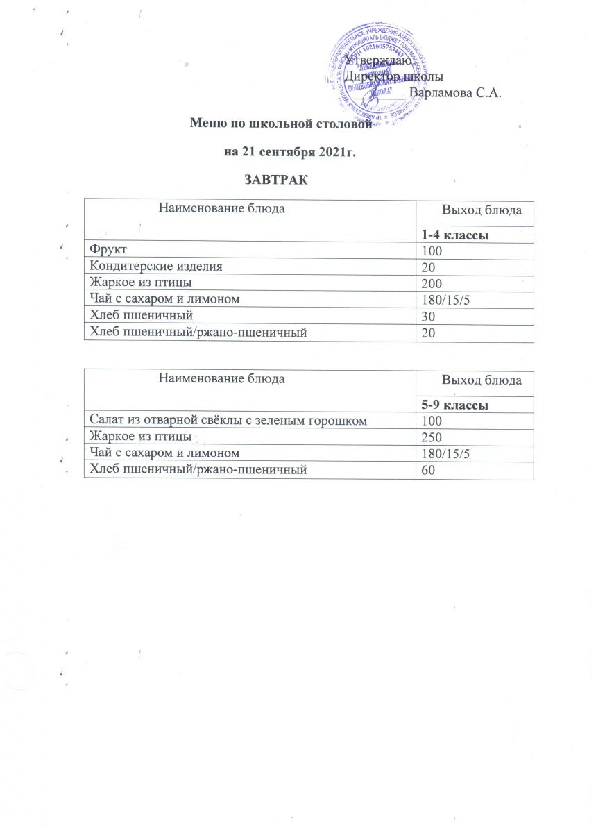 Примерное двухнедельное меню для учащихся 5-9 классов на первое полугодие 2021-2022 учебны год.