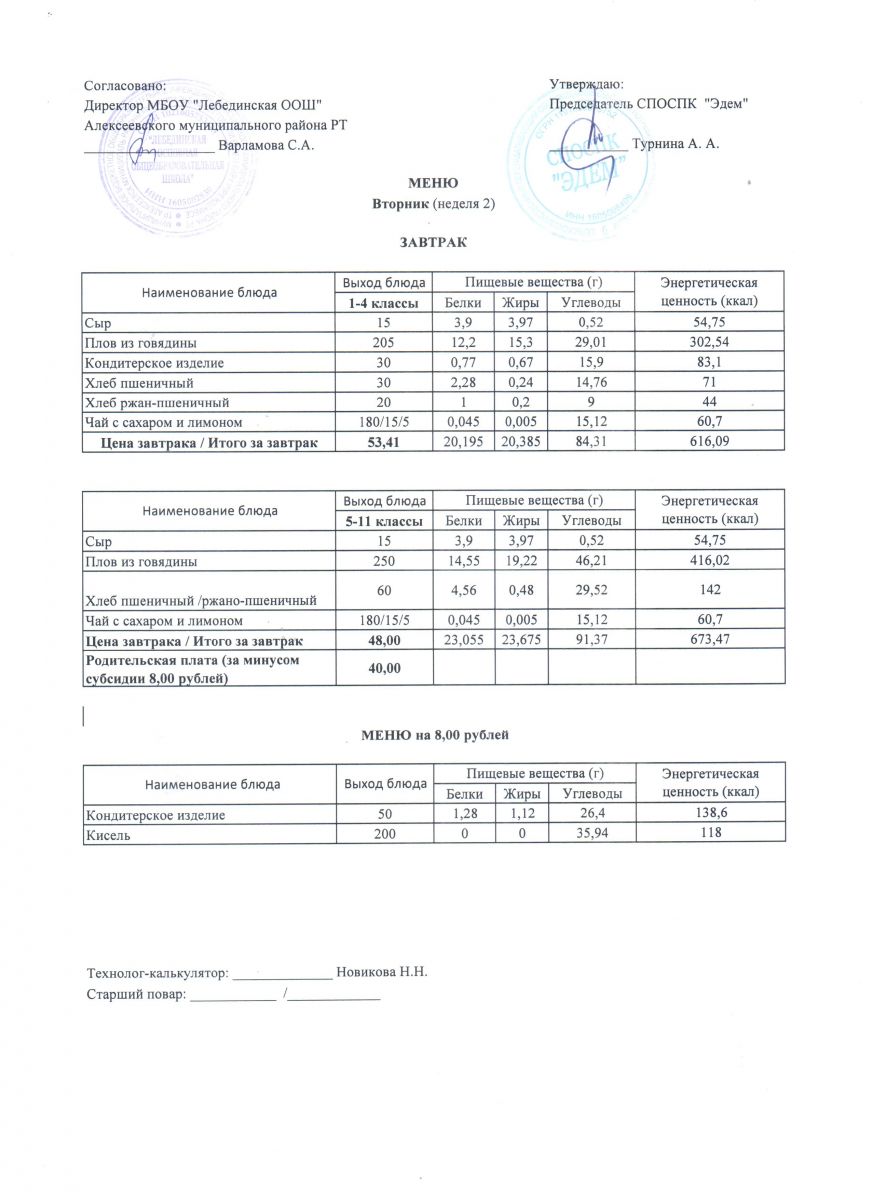 Меню по школьной столоовой на 2022г вторник 2 неделя