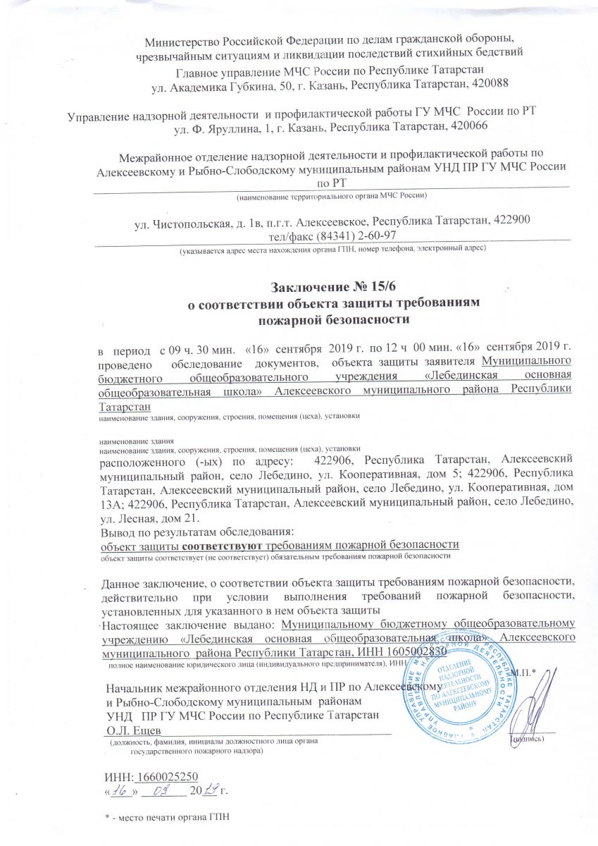 Заключение о соответсвии объекта защиты требованиям пожарной безопасности