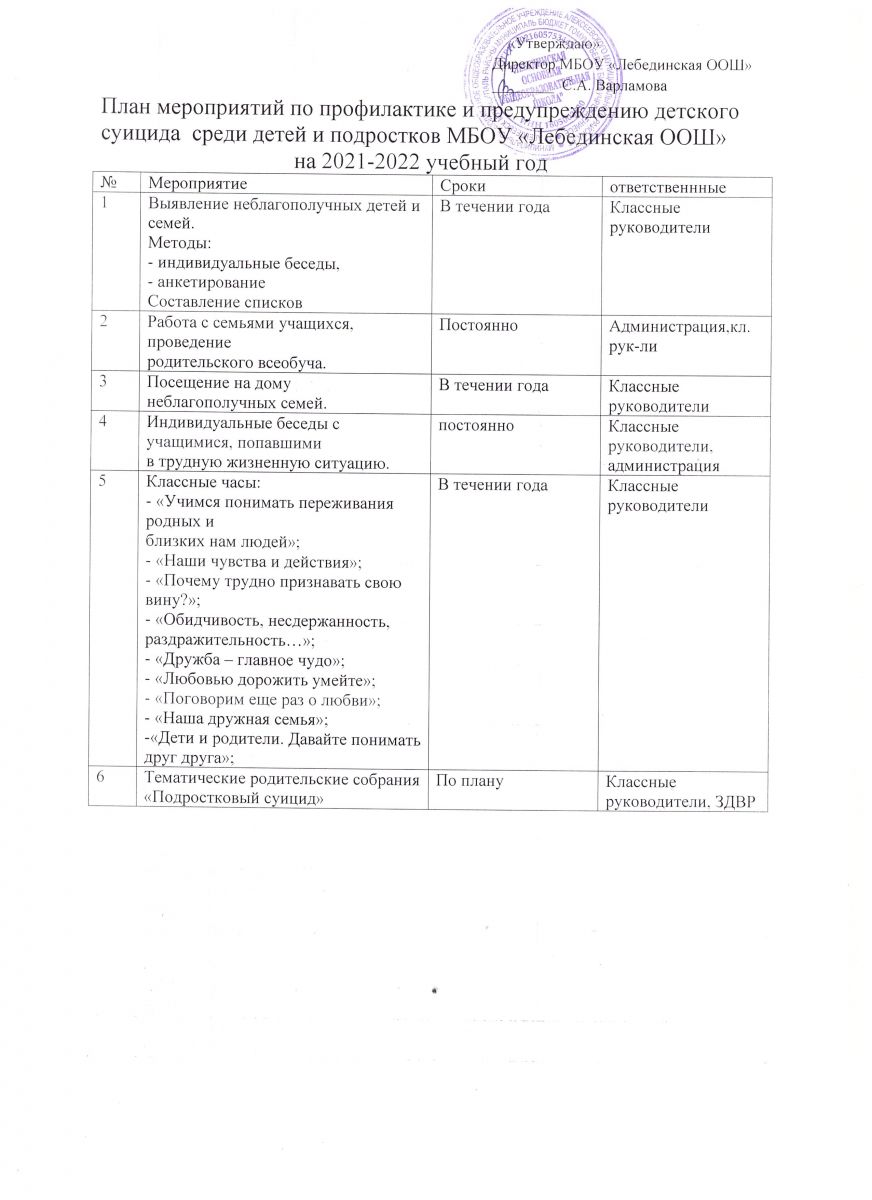 План мероприятий по профилактике и предупреждению детского суицида среди несовершеннолетних
