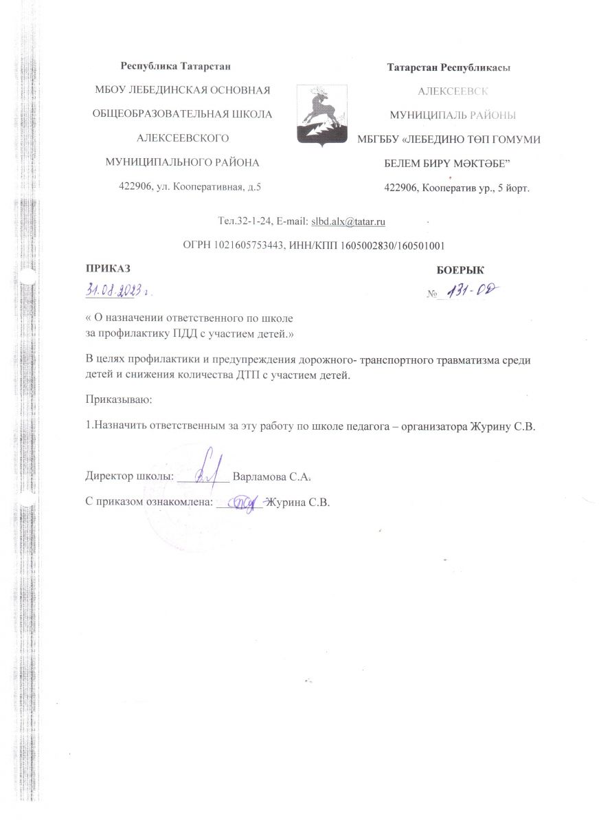 Приказ о назначении ответственного по школе за профилактику ПДД с участием детей 2023-2024г