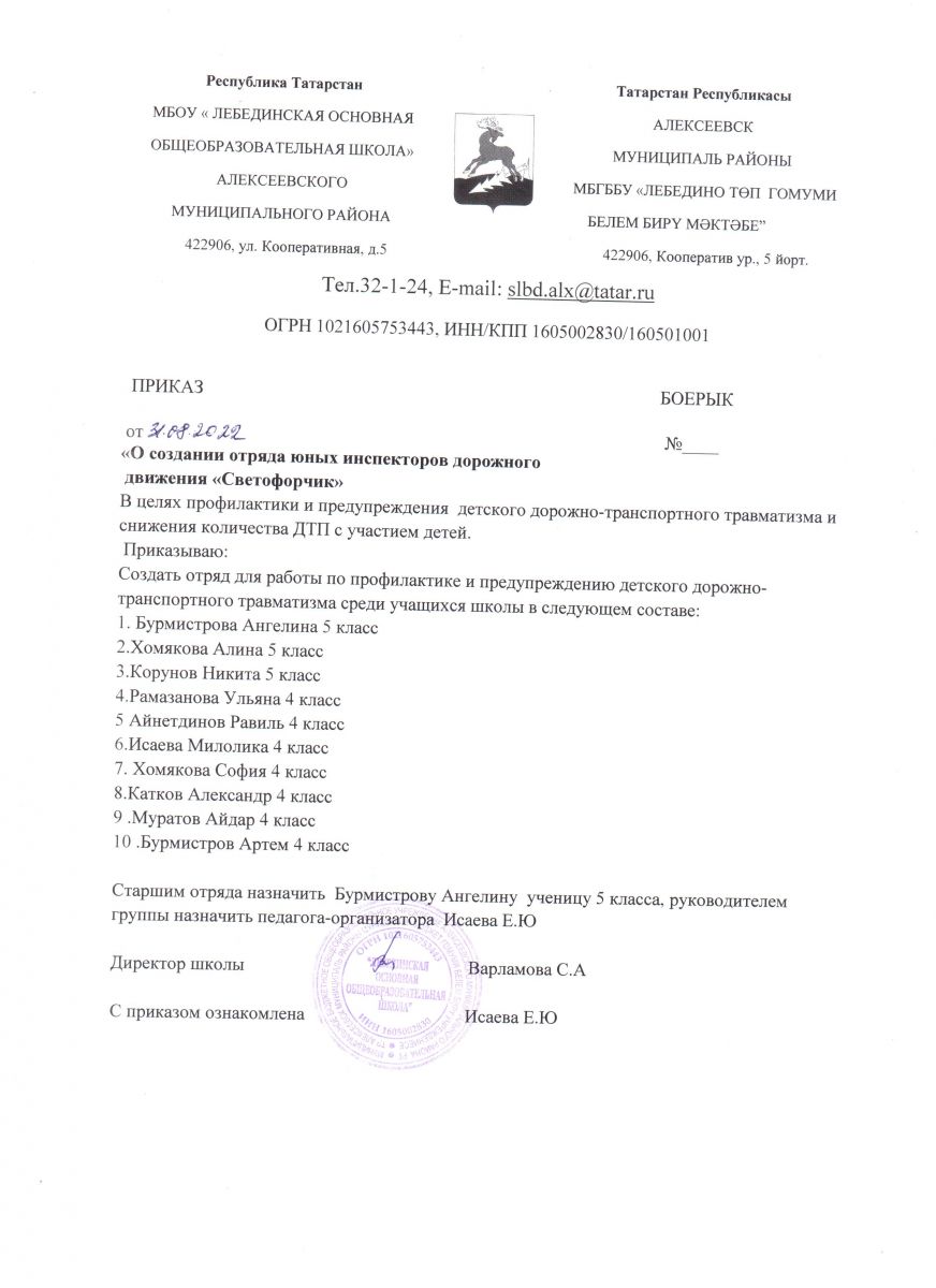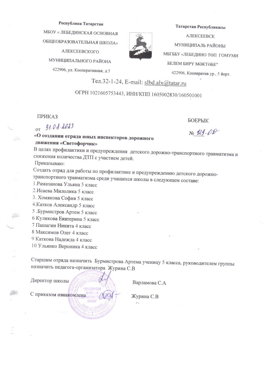 Приказ о создании отряда юных инспекторов дорожного движения 2023-2024г.