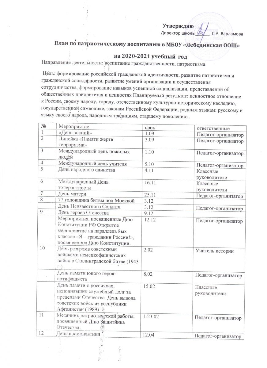 План работы по патриотическому воспитанию 2020-2021 учебный год