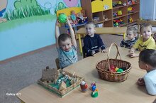 Дети младшей группы на занятии по развитию речи рассказывали про домашних животных, которые живут у бабушке в деревне. Помогли бабушке разобрать кладовку. Поиграли в подвижную игру "Найди пару", отгадывали загадки. Поставили постановку сказки "Рукавичка"