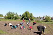 Воспитанники лагеря трула и отдыха на прополке грядок пришкольного учебно-опытного участка