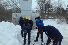 Учащиеся 7-9 класса под руководством преподавателя ОБЖ Зудина А.Г. провели очистку от снега памятника павшим воинам.