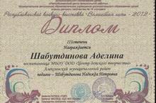 Ученица 4 класса, воспитанница кружка "Умелые руки" ( руков. Шабутдинова Н.П.) Шабутдинова Аделина награждена дипломом 3 степени за участие в Республиканском конкурсе-выставка "Волшебная нить - 2012".