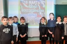 Сегодня отмечается седьмая годовщина воссоединения Крыма с Россией. В школе прошли классные часы. Для начальных классов проведен классный час «Мы вместе. 7 лет Воссоединения Крыма с Россией"