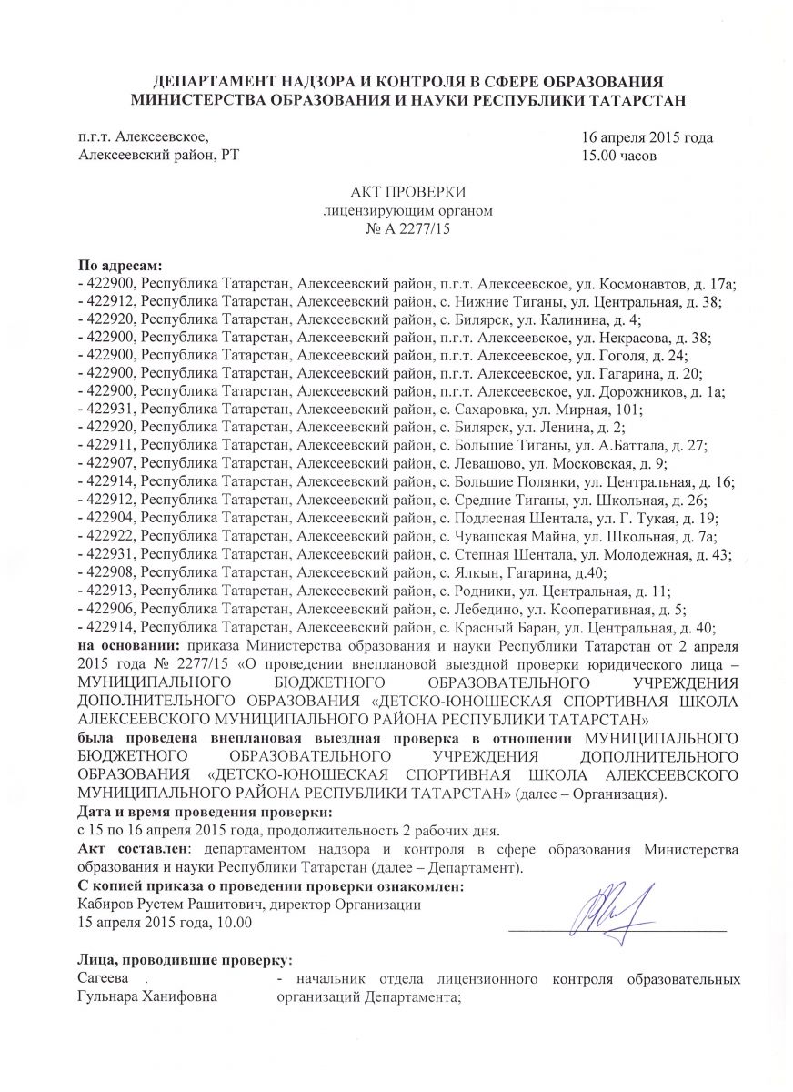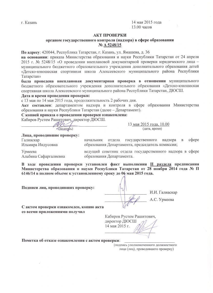 Акт проверки Департамента надзора и контроля в сфере образования МОиН РТ