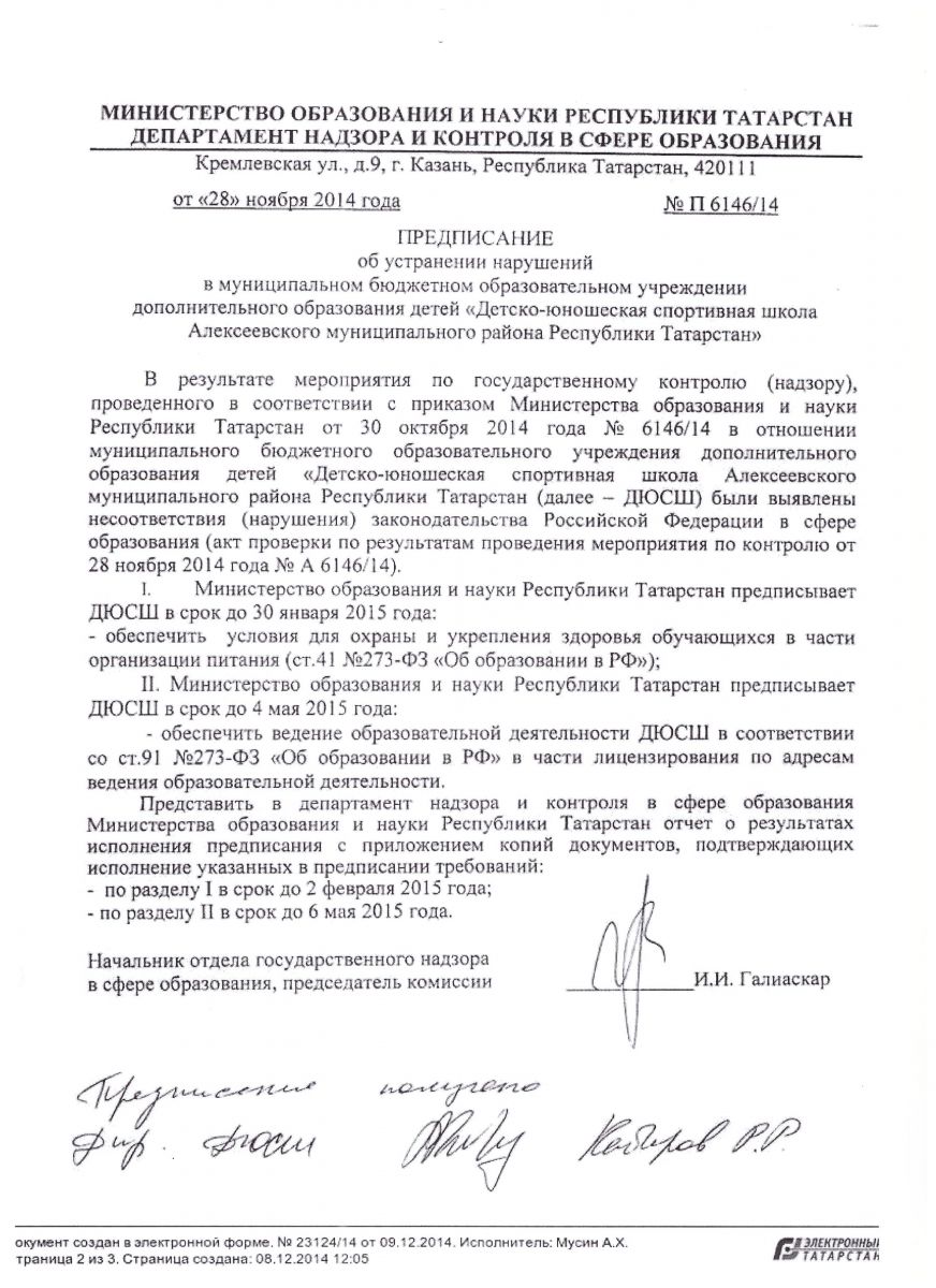 Предписание об устранении нарушений в ДЮСШ от 28.11.2014 г. № П6146/14