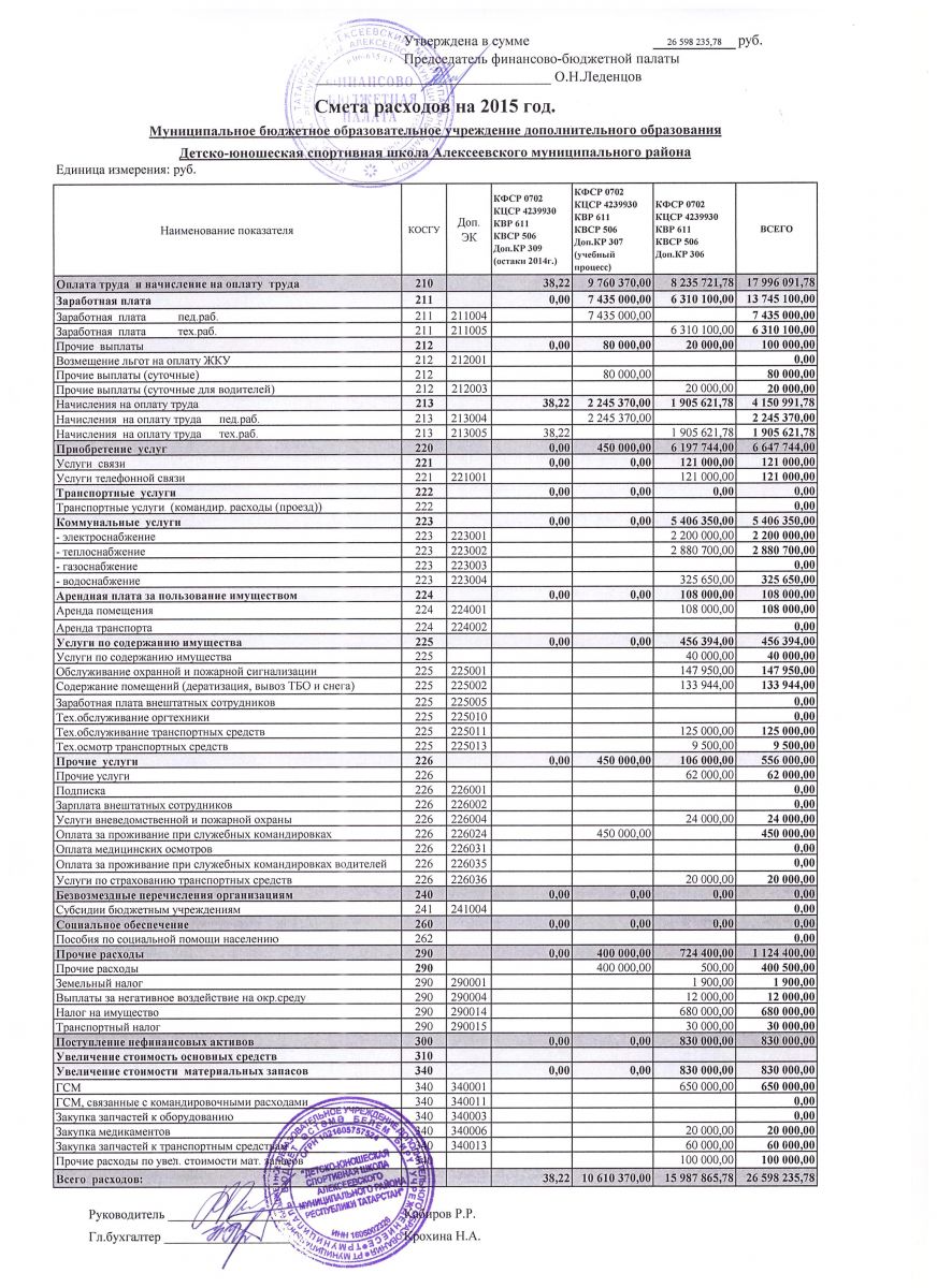 Отчет о кассовом поступлении и выбытии средств ДЮСШ на 1.01.2015