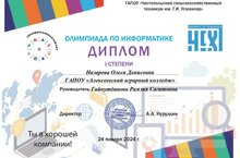 24 января 2024 года студенты Алексеевского аграрного колледжа Назарова Олеся, Каюмов Ильназ, Балякин Глеб приняли участие в олимпиаде по информатике, которая состоялась на базе ГАПОУ «Чистопольский сельскохозяйственный техникум им. Г.И. Усманова» и были награждены дипломами 1,2, и 3 степени. Студентов подготовила для участия в олимпиаде преподаватель Гайнутдинова Р.С.