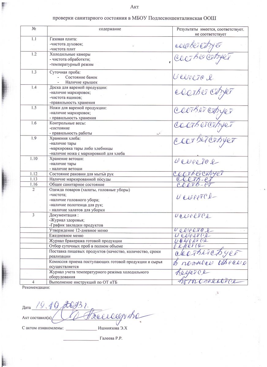 МБОУ Подлесношенталинская ООШ АКТ проверки столовой за февраль 2023г