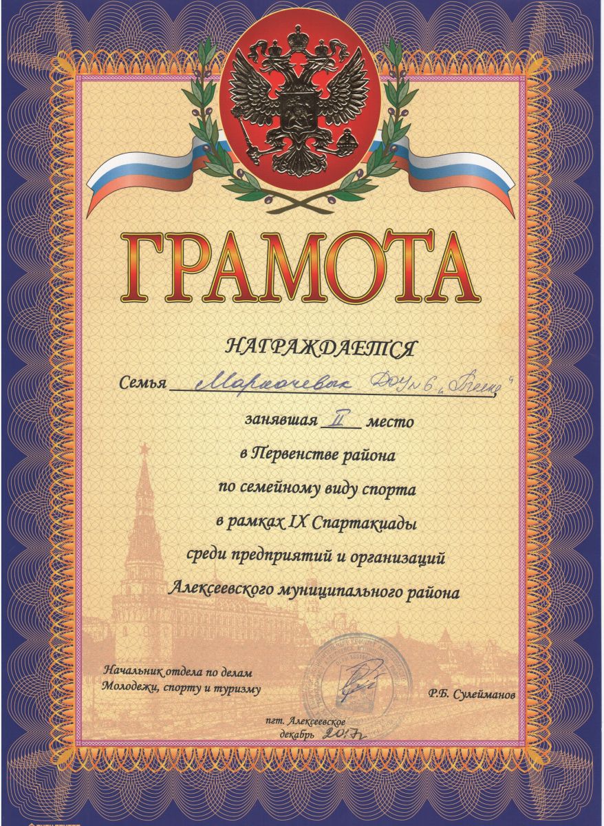 Грамота II степени в Первентстве района по семейному виду спорта в рамках IX Спартакиады