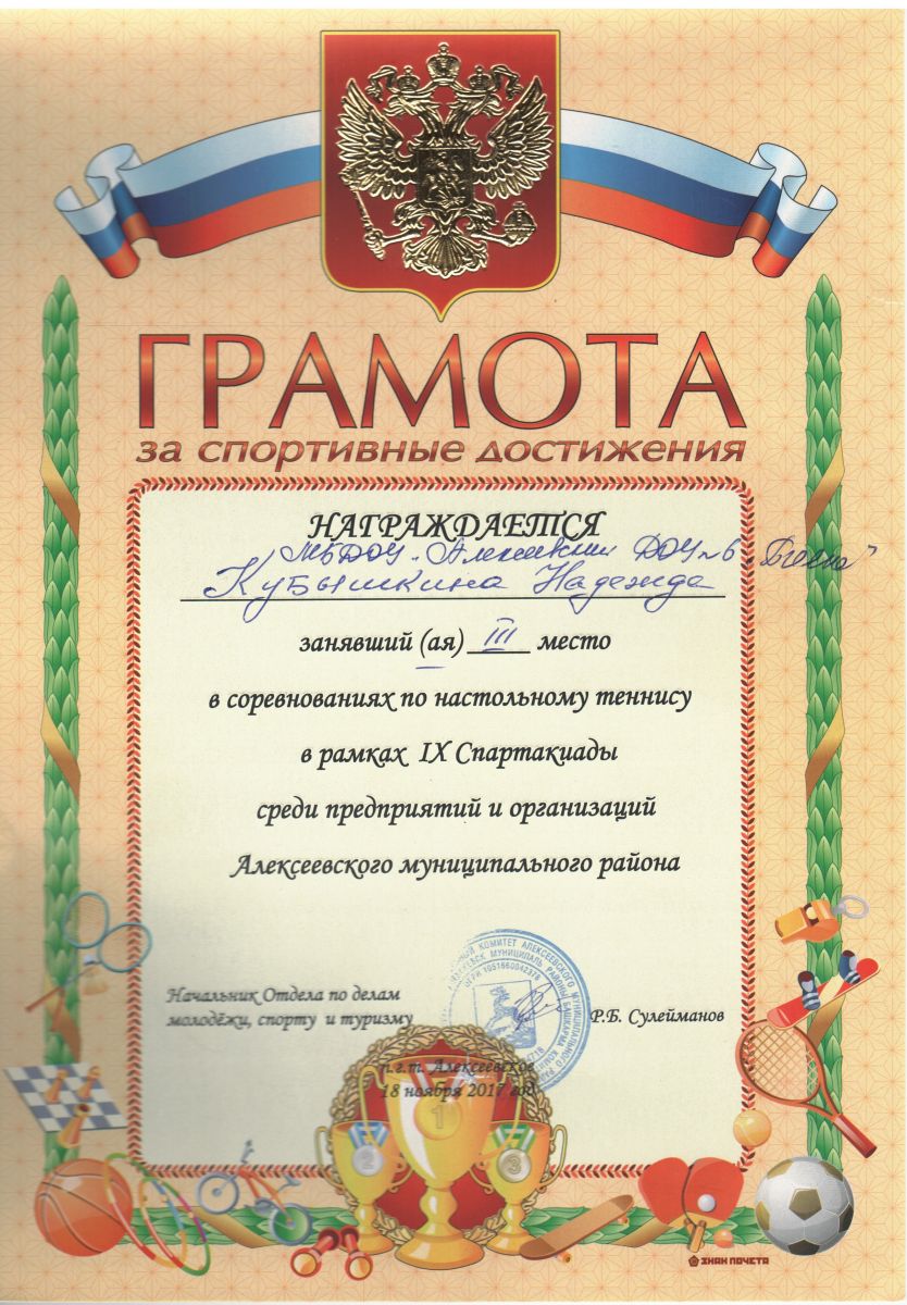 Грамота III степени в соревнованиях по настольному в рамках IX Спартакиады