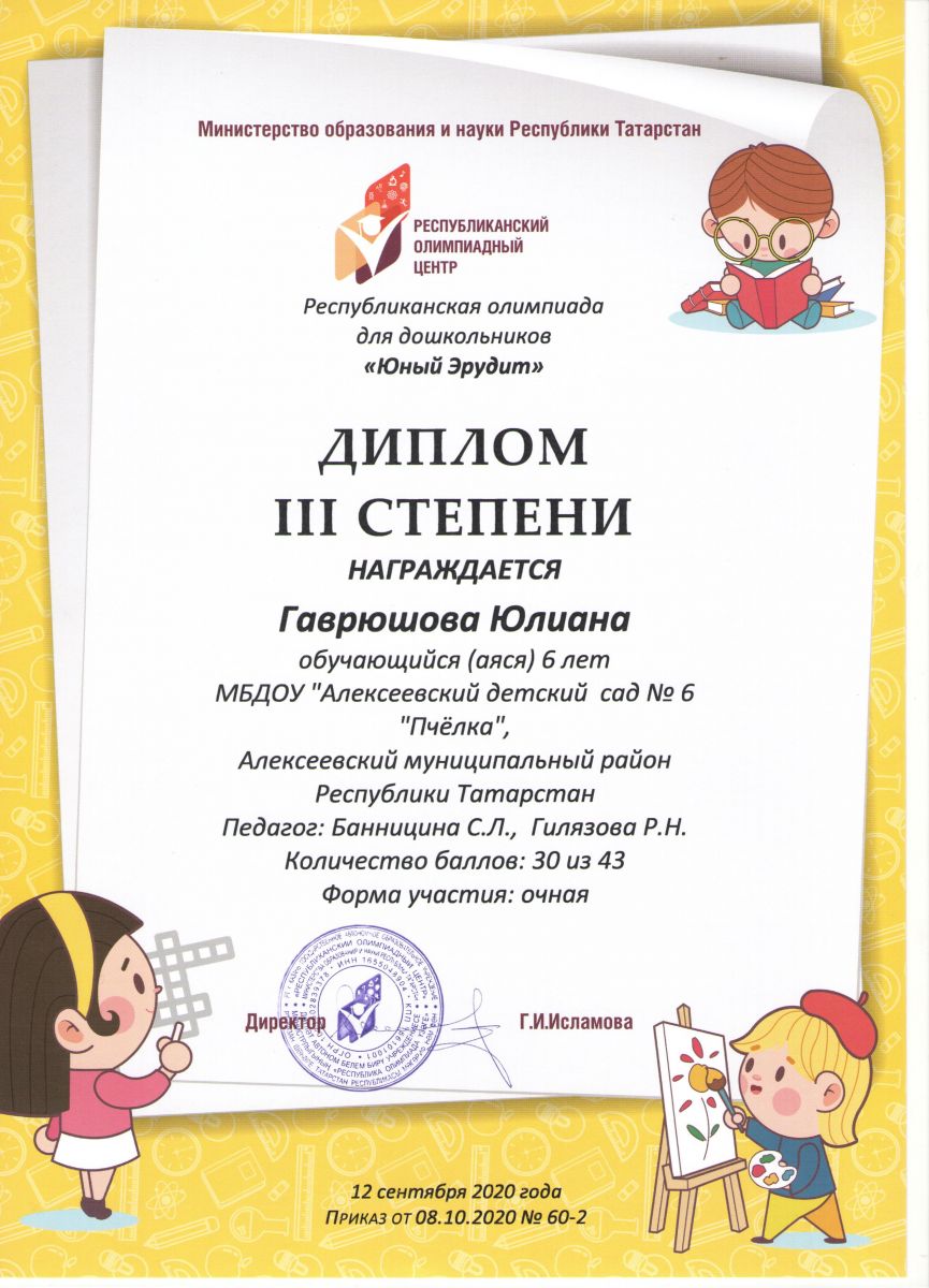 Диплом 3 степени - Республиканская олимпиада для дошкольников "Юный Эрудит"