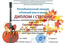 Очередная награда в копилке учащихся Центра детского творчества. Сергеев Алексей, учащийся студии "Зеркало" (педагог Лисин И.А.) награждён Дипломом I степени Республиканского конкурса "Осенний рок-н-ролл". Поздравляем Алексея и Игоря Алексеевича с ярким успехом.