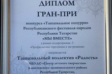 В сентябре наш хореографический ансамбль «Радость» (педагог Мустафаев Илькин) принял заочное участие в Республиканском фестивале народов Республики Татарстан «Мы вместе», где стали победителями в номинации «Танцевальное попурри» и заслуженно получили диплом Гран-При. Поздравляем коллектив ансамбля «Радость» и педагога с победой! Желаем не останавливаться на достигнутом результате и стремиться развиваться и познавать все большее. Пусть всегда горит энтузиазм в глазах, и раскрываются возможности. Вперед, к новым победам!