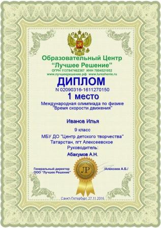 Международная олимпиада по физике "Время скорости движения", Иванов Илья, 1 место, ноябрь 2016 г.