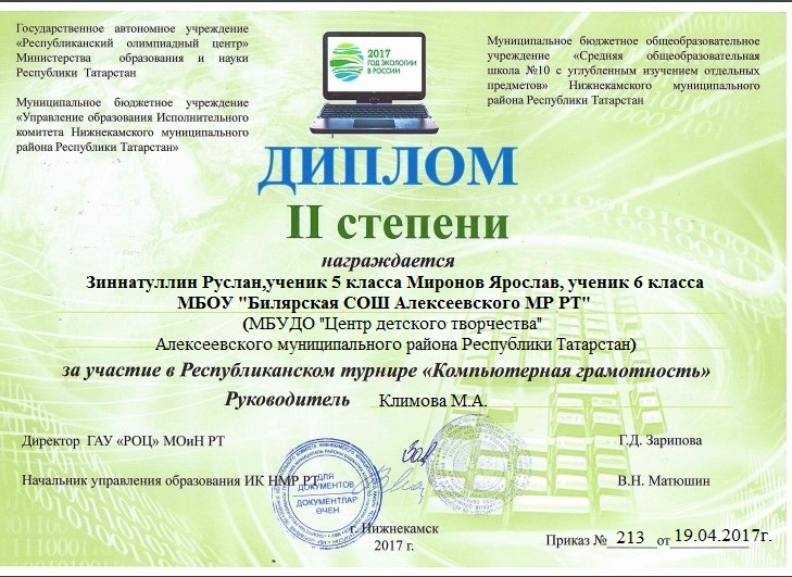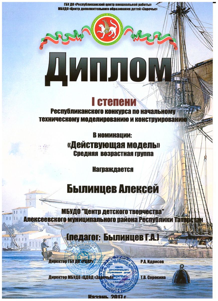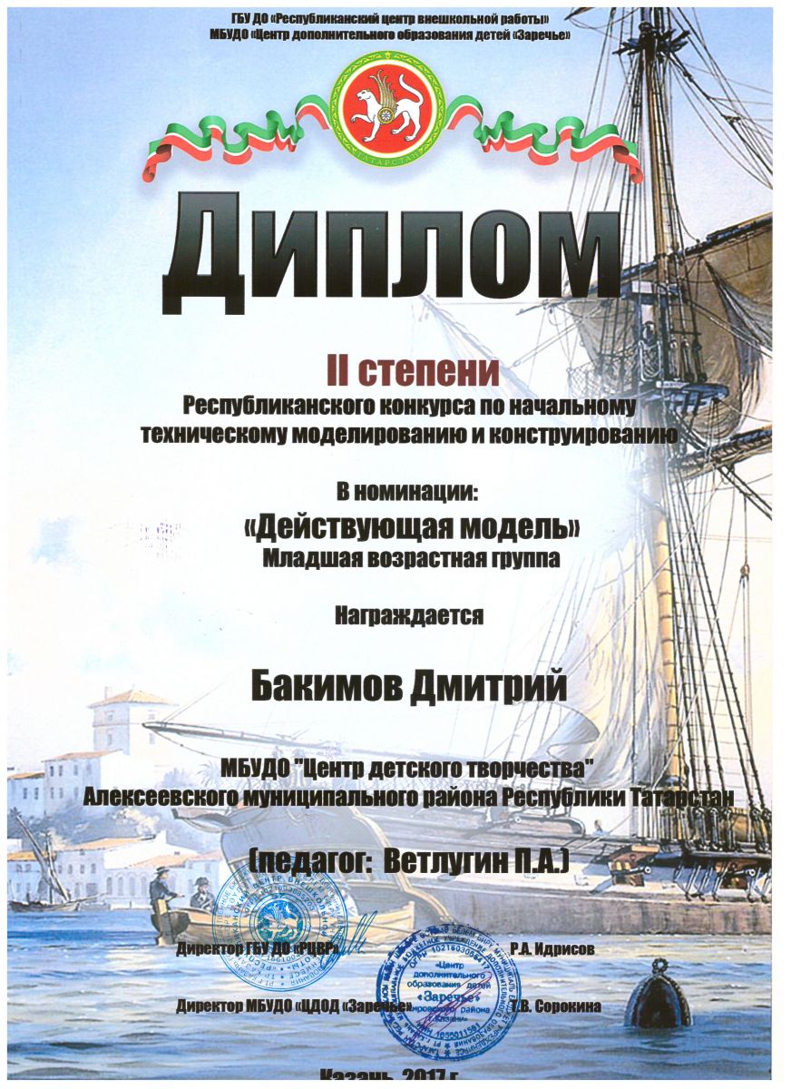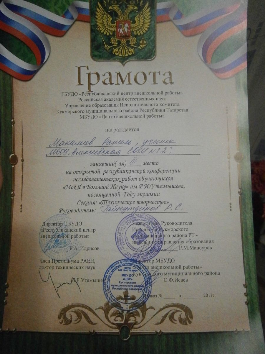 X Республиканская олимпиада юных изобретателей "Кулибины XXI", Диплом II место, май 2017 г.