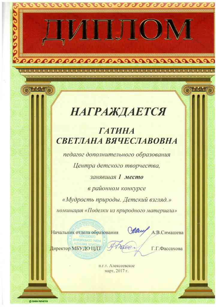 Районный конкурс "Мудрость природы. Детский взгляд", Гатина С.В., 1 место, март 2017 г.