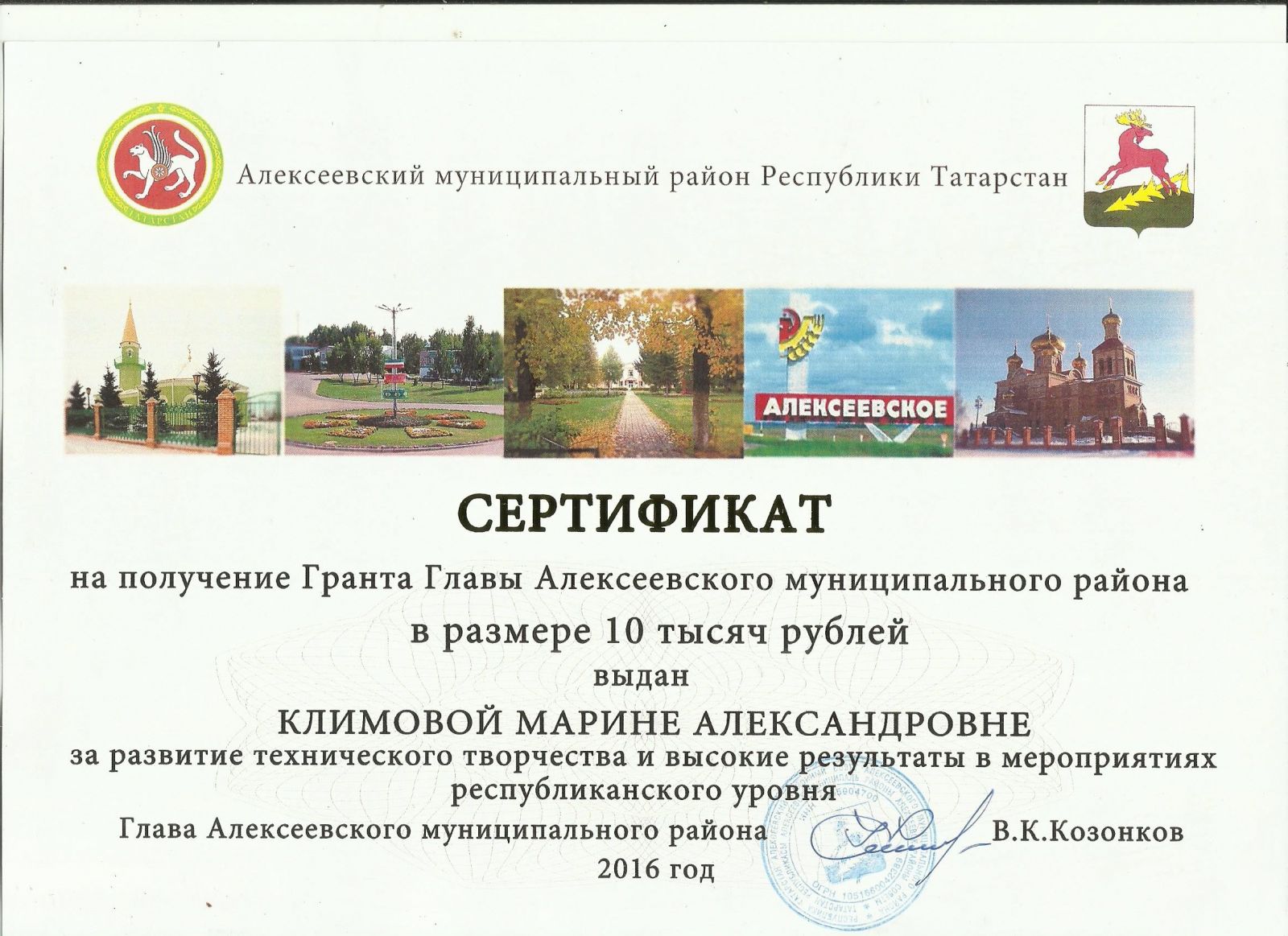 Грант Главы Алексеевского муниципального района, Климова М.А., сентябрь 2016 г.