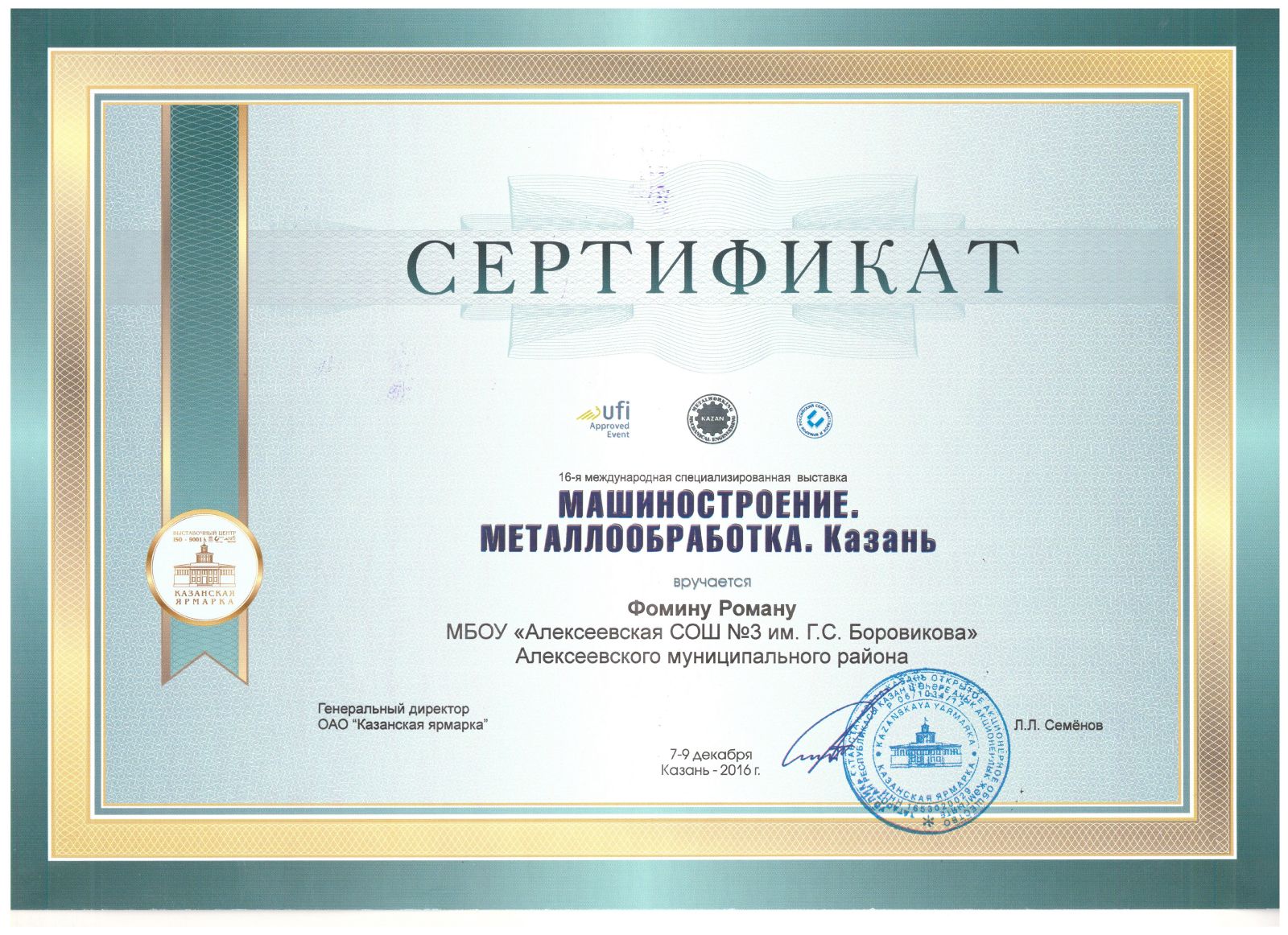 16-я международная специализированная выставка выставка, Фомин Роман, Сертификат, декабрь 2016 г.