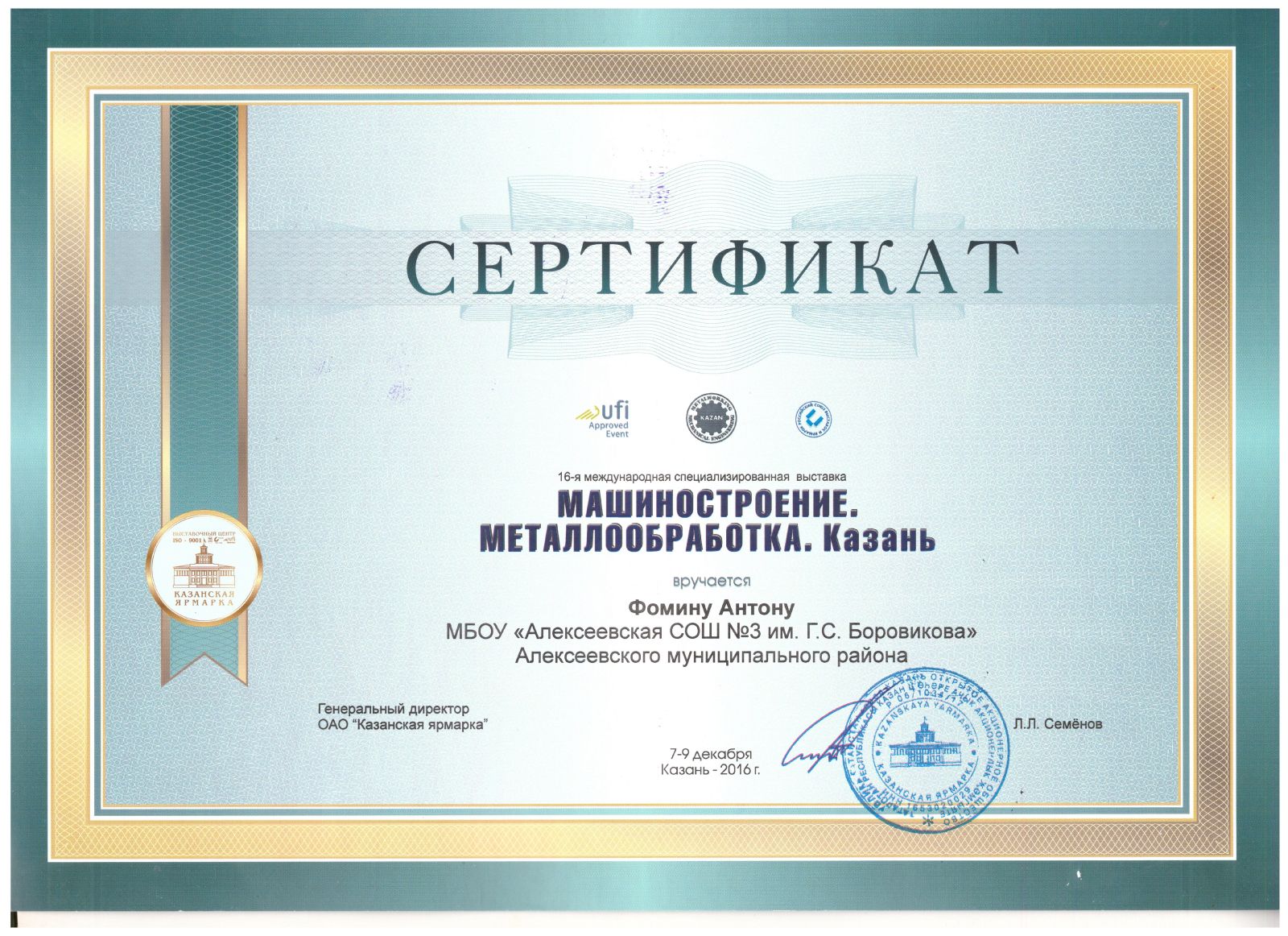 16-я международная специализированная выставка, Фомин Антон, Сертификат, декабрь 2016 г.