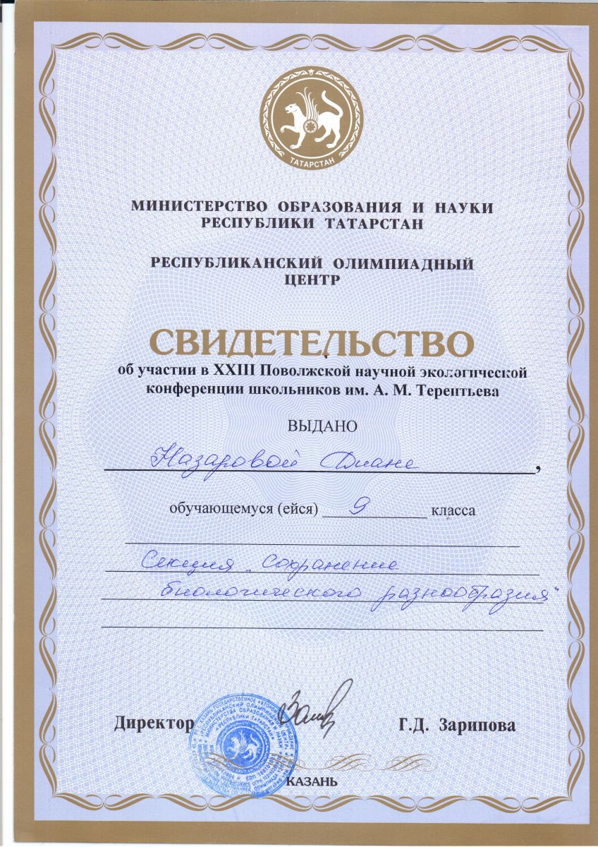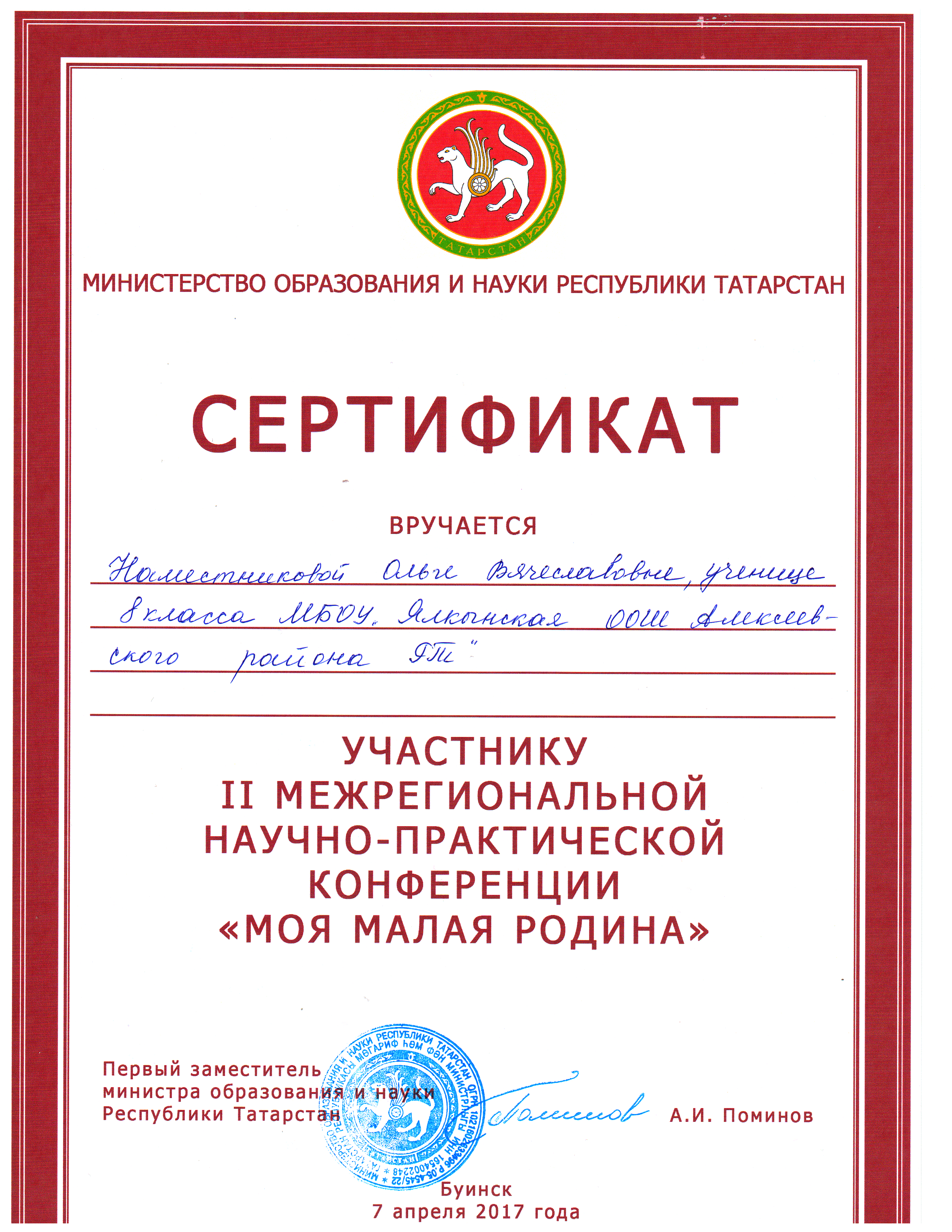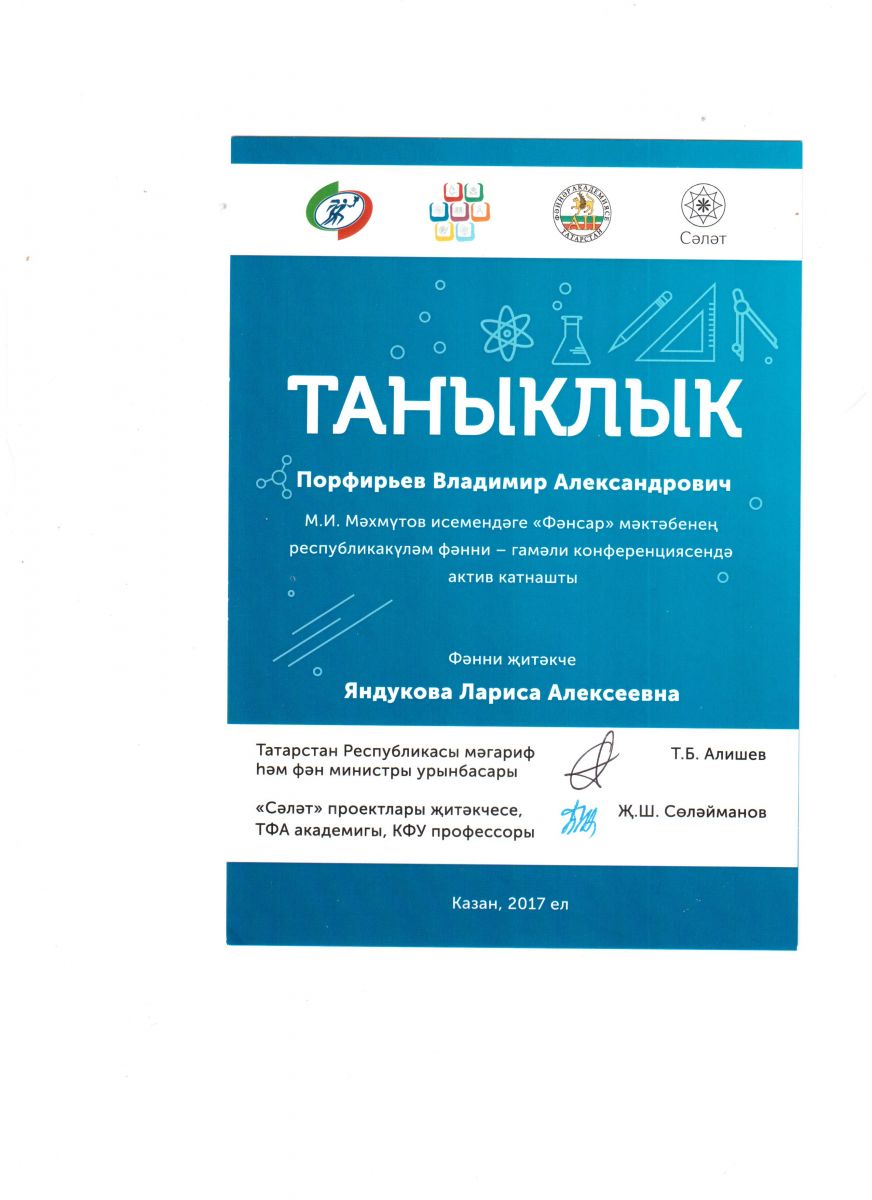 Республиканская конференция "Фэнсар", Порфирьев Владимир, Свидетельство участника, 2017 г.