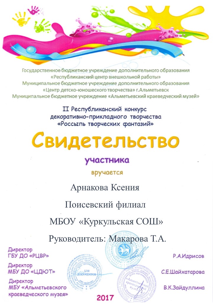 II Республиканский конкурс декоративно-прикладного творчества "Россыпь творческимх фантазий", Арнакова Ксения, Свидетельство участника, февраль 2017 г.