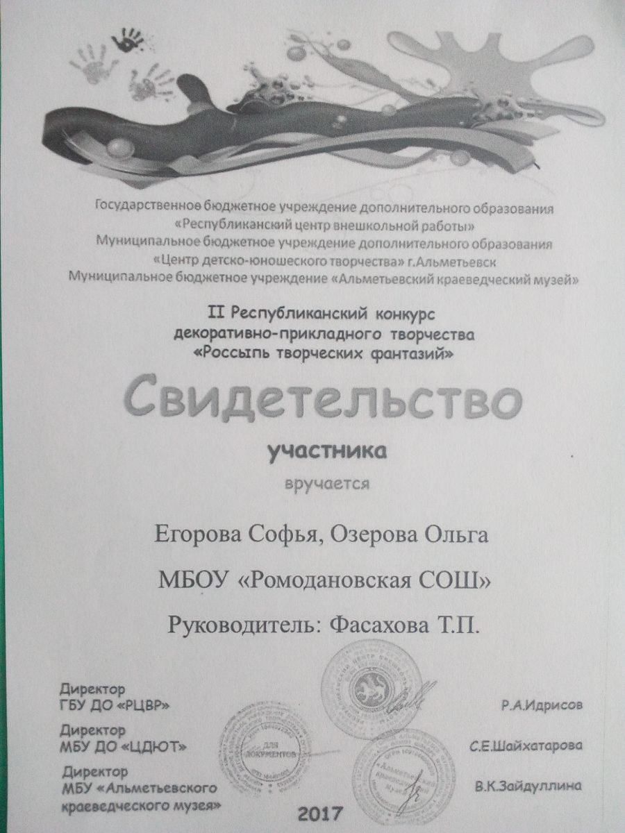 II Республиканский конкурс декоративно-прикладного творчества "Россыпь творческих фантазий", Цыганова Ярослава, Степанова София, Свидетельство участника, февраль 2017 г.