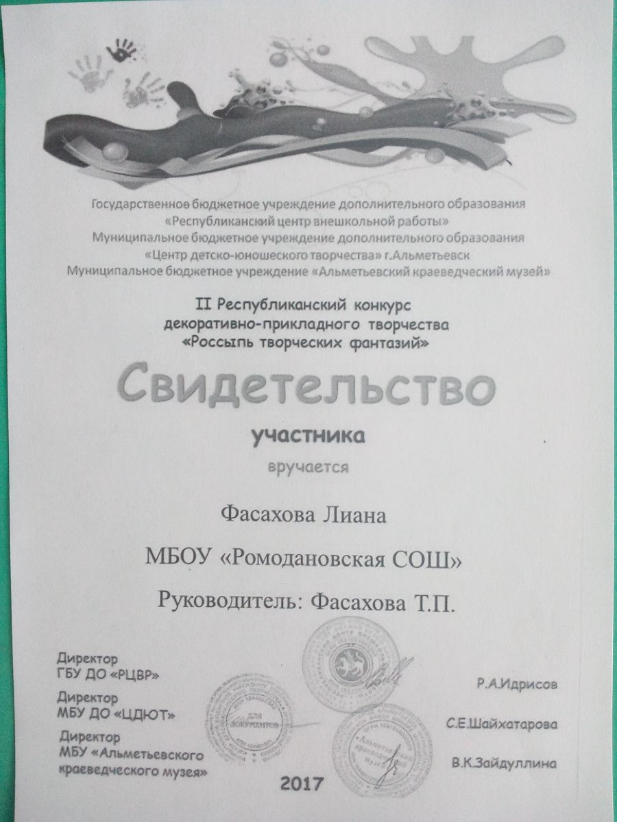 II Республиканский конкурс декоративно-прикладного творчества "Россыпь творческих фантазий", Фасахова Лиана, Свидетельство участника, февраль 2017 г.