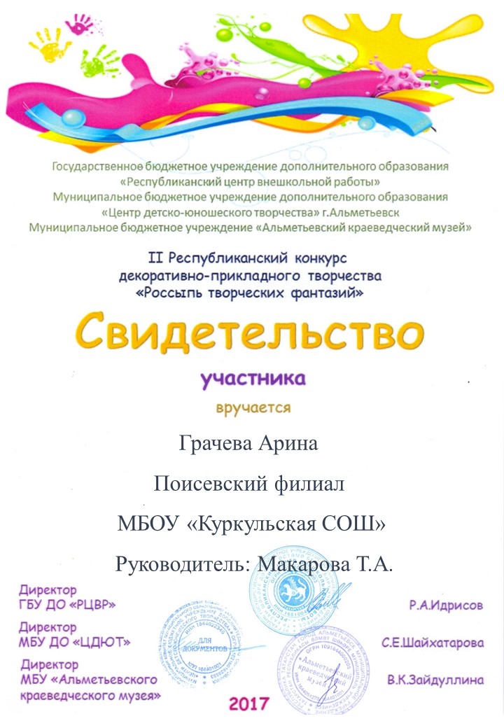 II Республиканский конкурс декоративно-прикладного творчества "Россыпь творческих фантазий", Грачева Арина, Свидетельство участника, февраль 2017 г.