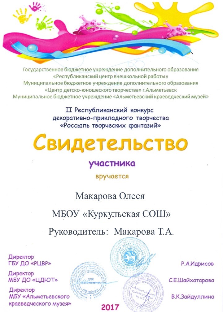 II Республиканский кокнурс декоративно-прикладного творчества "Россыпь творческих фантазий", Макарова Олеся, Свидетельство участника, февраль 2017 г.
