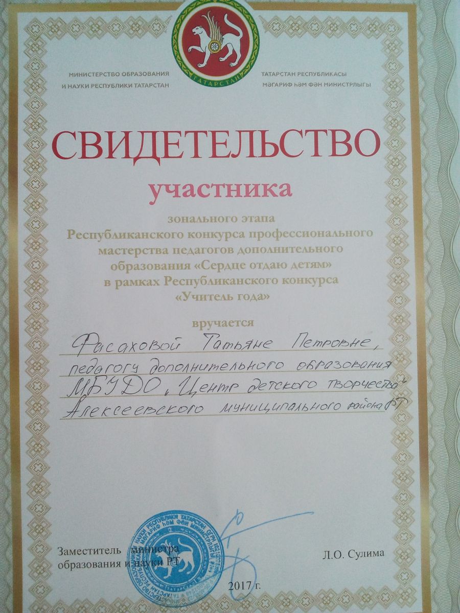 Зональный этап Республиканского конкурса профессионального мастерства ПДО "Сердце отдаю детям", Фасахова Т.П., Свидетельство участника, апрель 2017 г.