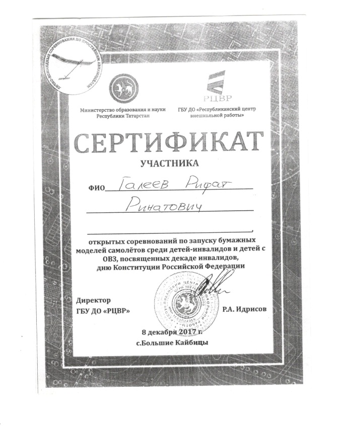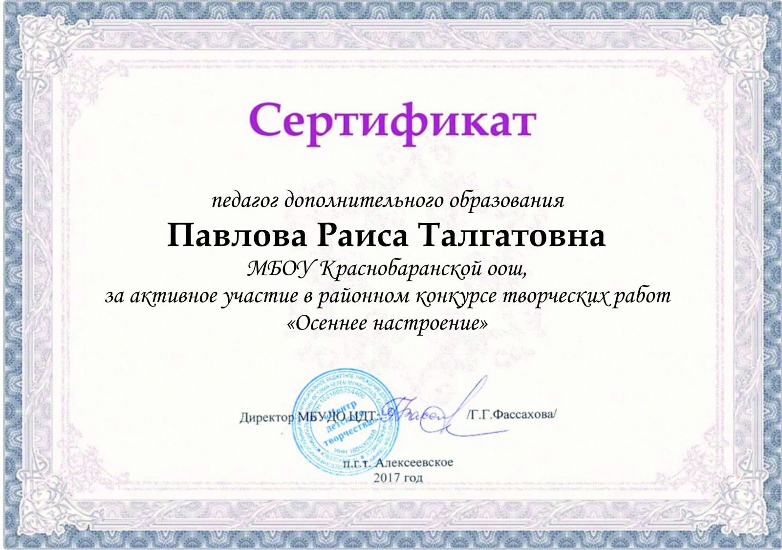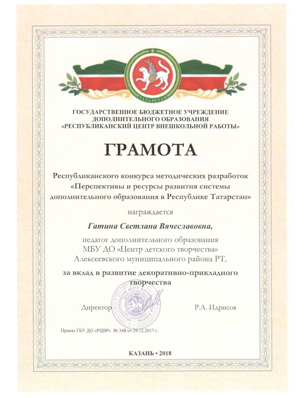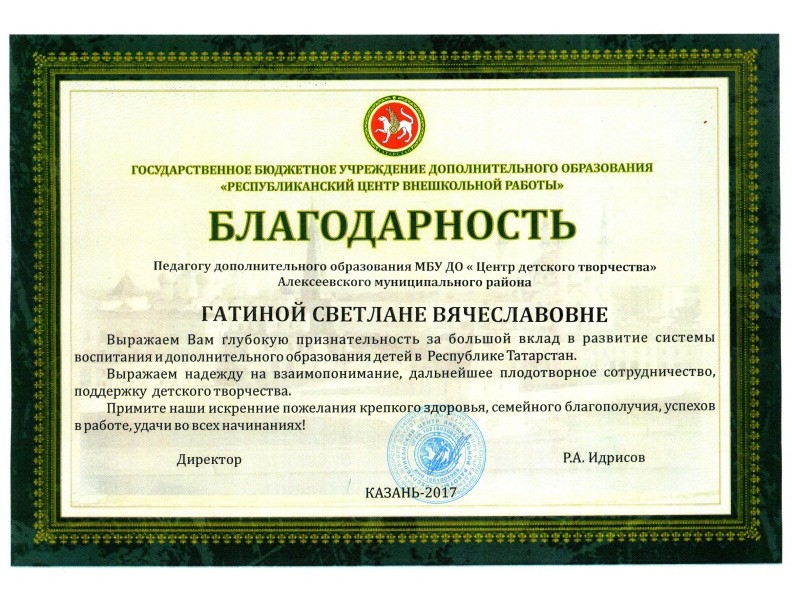 ► Благодарность педагогу дополнительного образования Гатиной С.В., сентябрь 2017