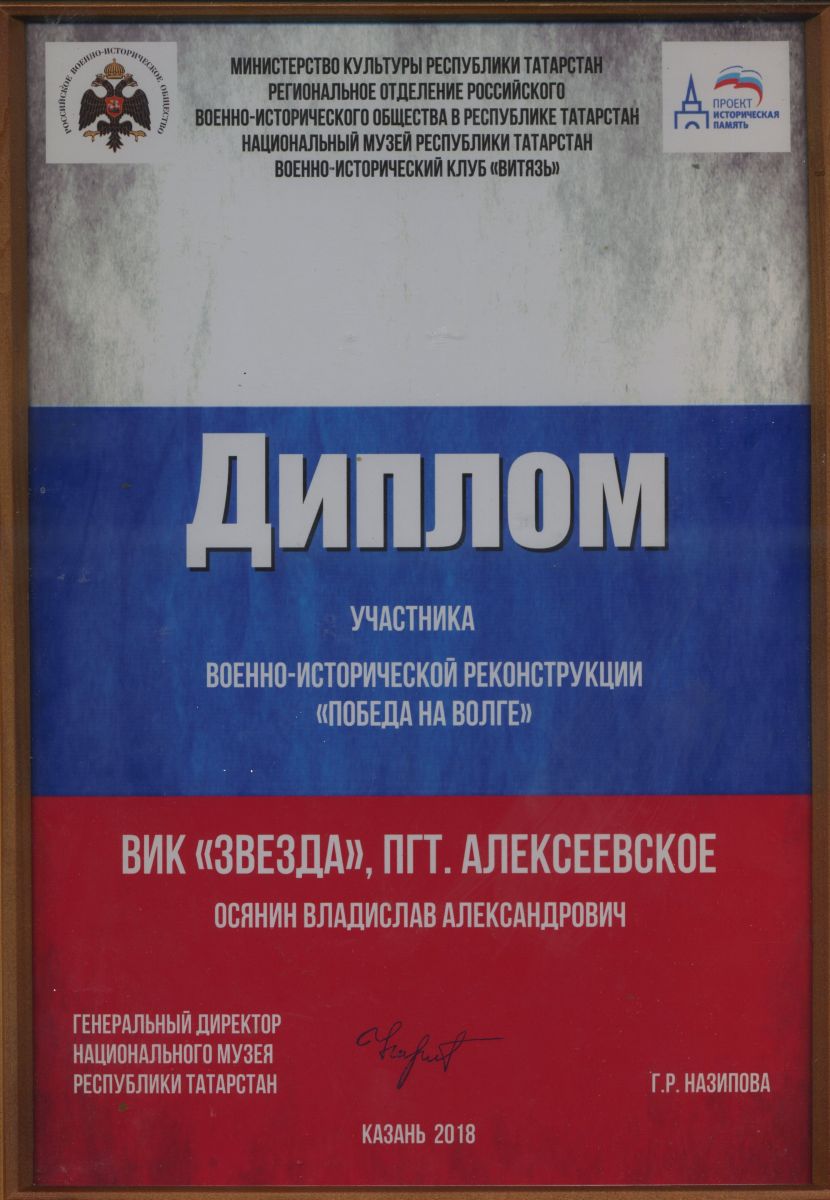 ► Диплом участника военно-исторической реконструкции "Победа на Волге", Осянин В.А., февраль 2018